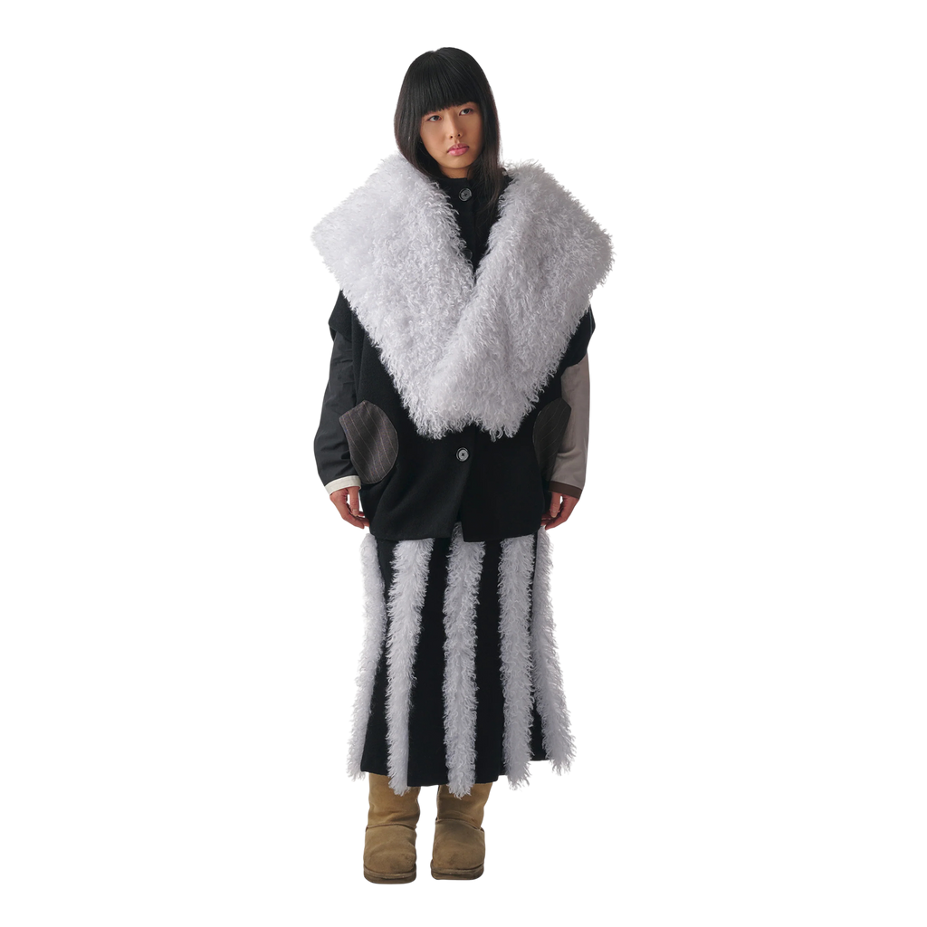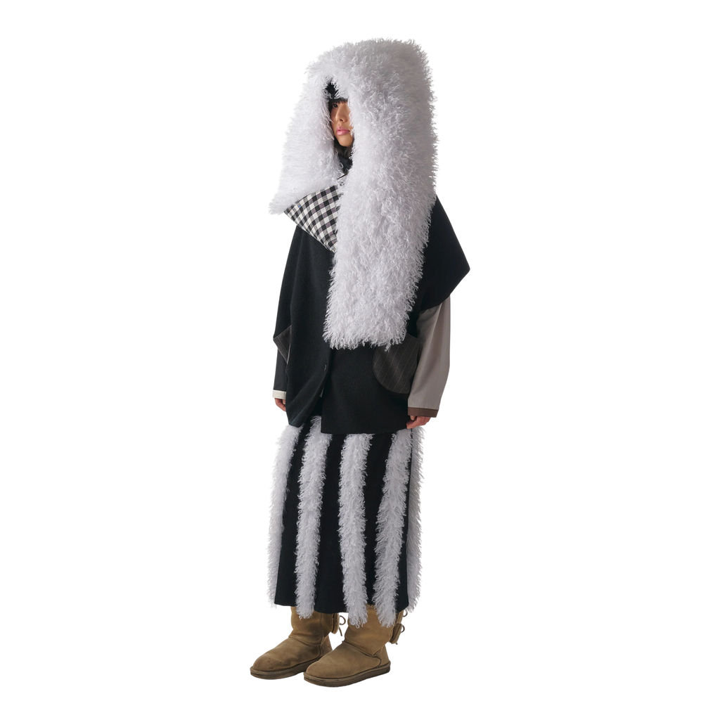 Draped sleeveless vest with an oversized faux fur collar that can be styled as a hood or wrap.