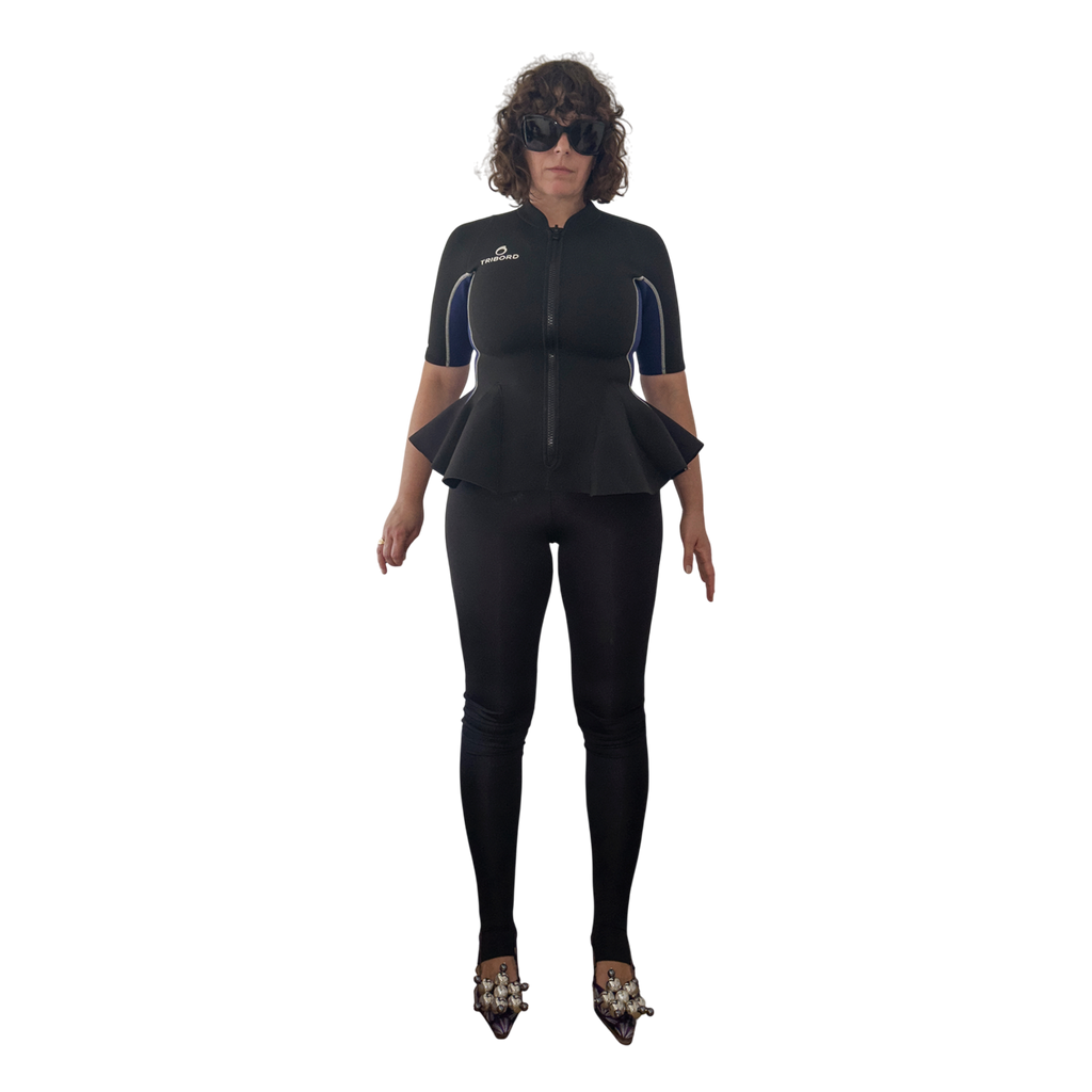 Made from a neoprene surf overall with zero waste. Unique pieces so only one available in size