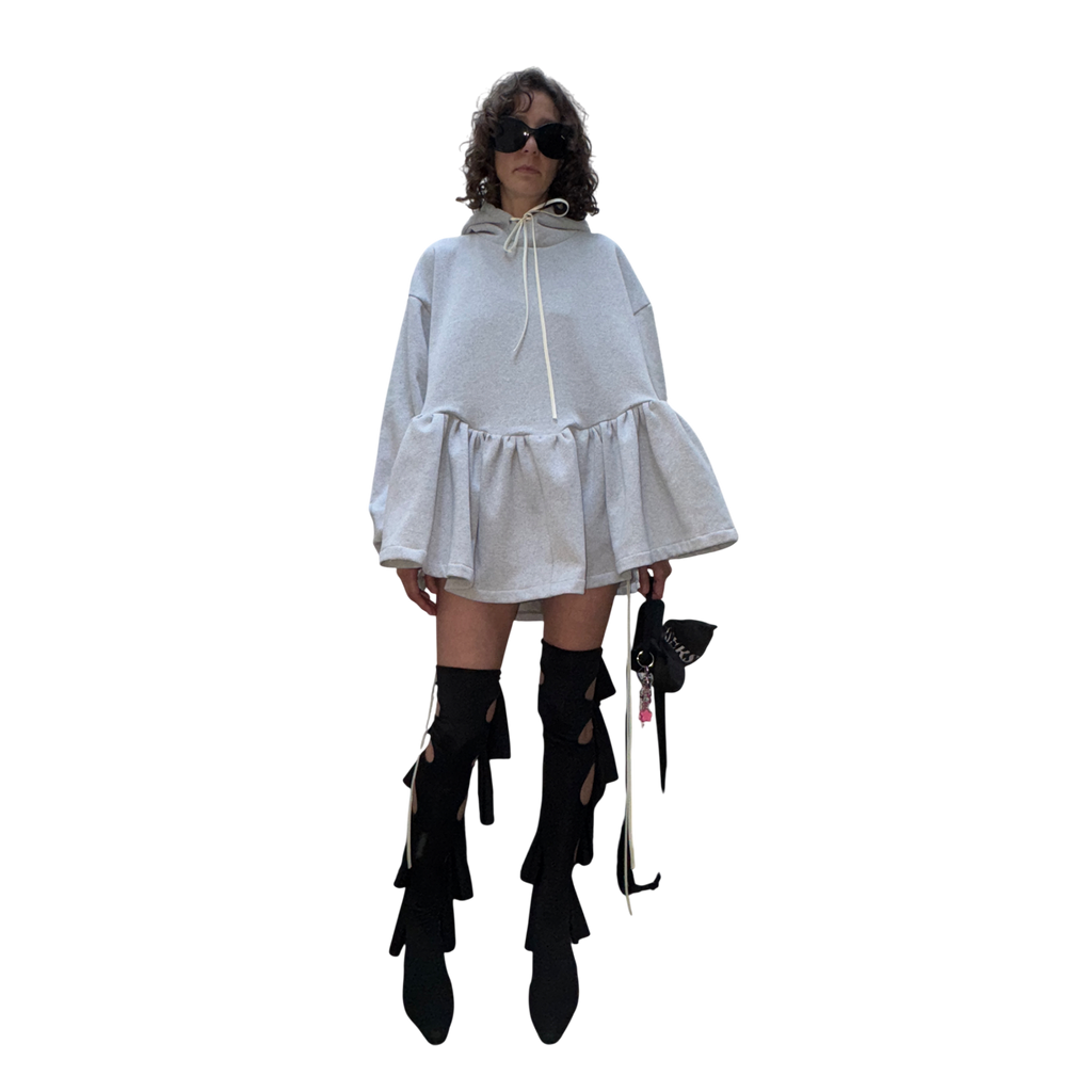 Merrfer from Barcelona creates fun, exaggerated designs from upcycled deadstock materials. Their pieces blend bright colors with hyper-feminine silhouettes, evoking a playful childhood nostalgia. Despite their whimsy, the bold designs also carry a punk edge, challenging conventions with a rebellious spirit.