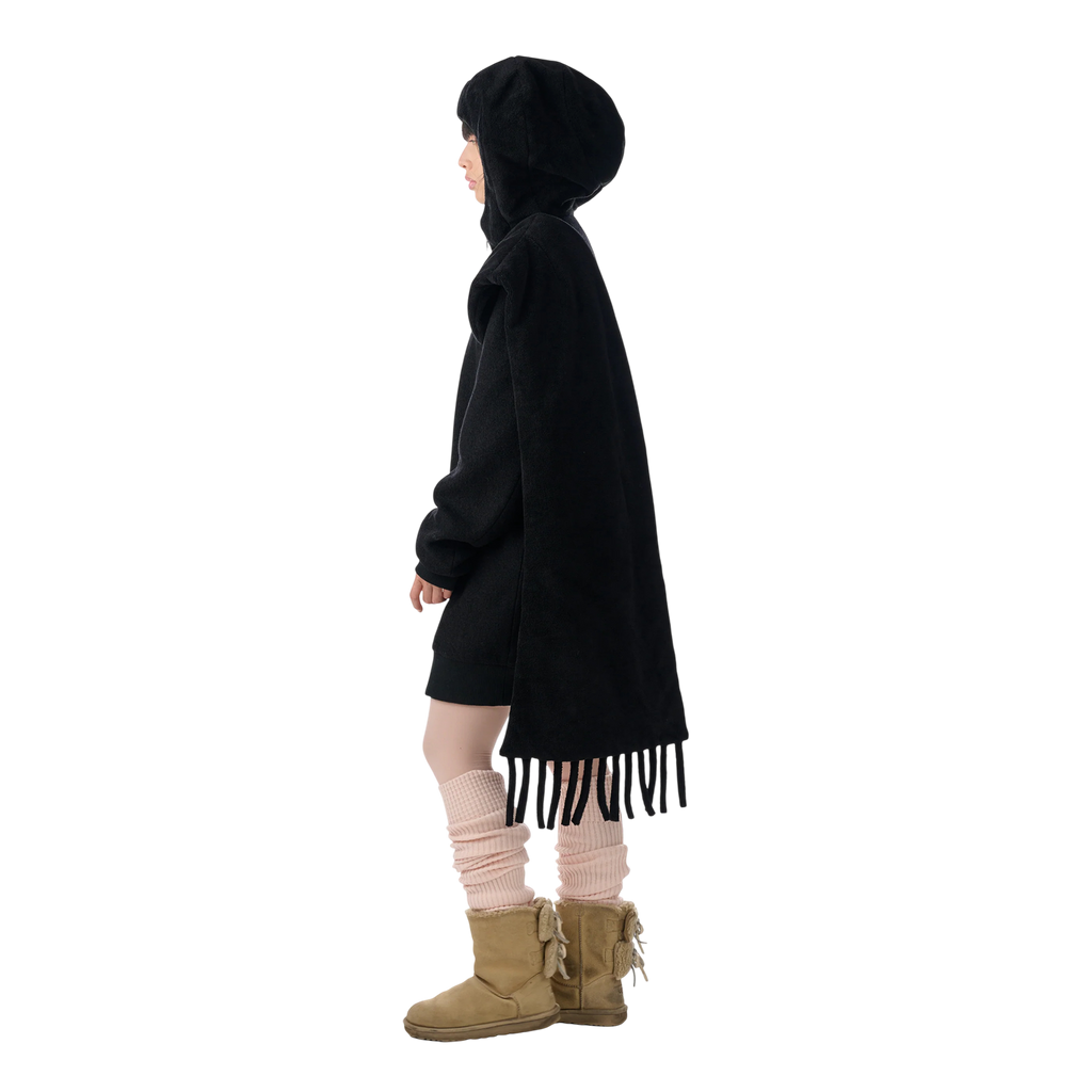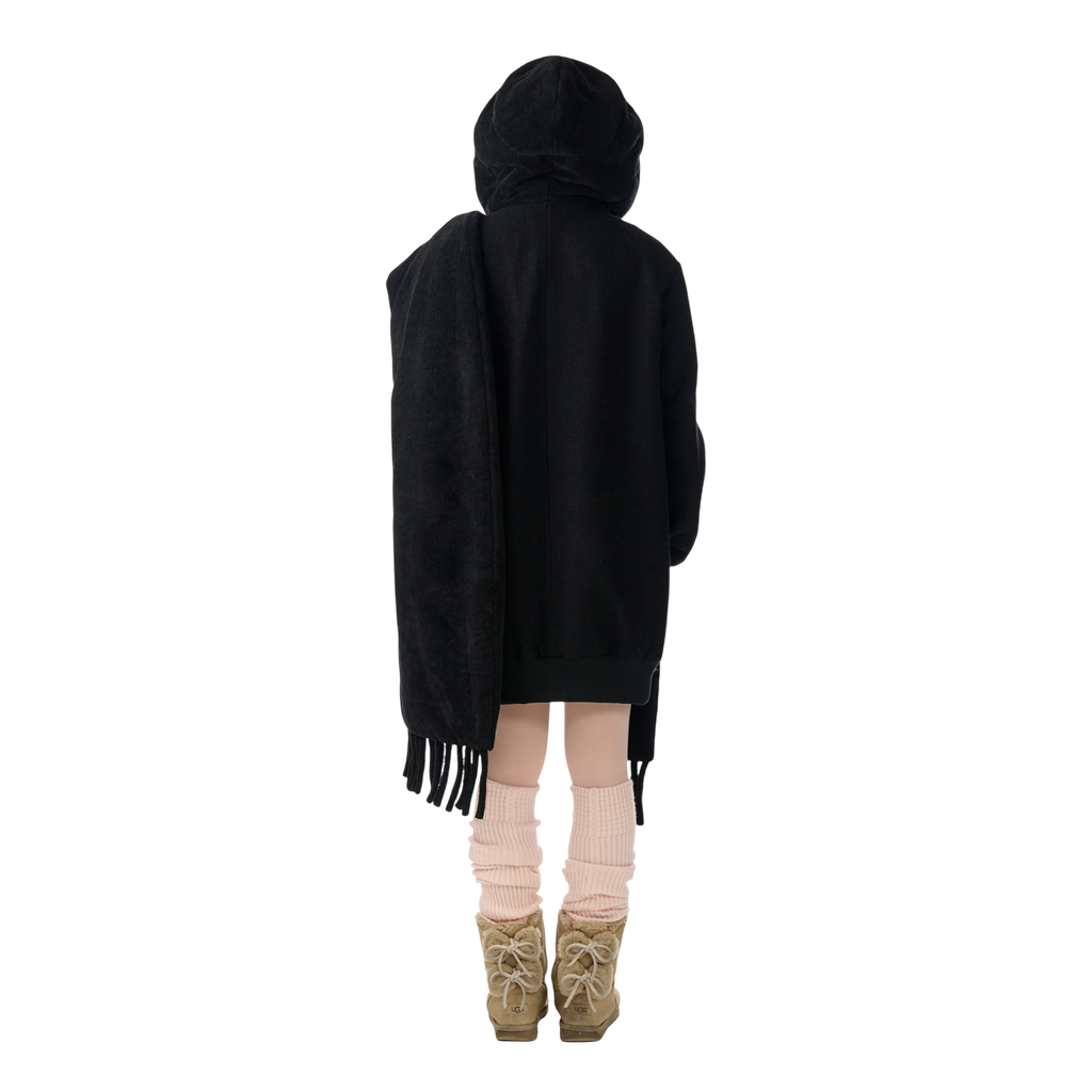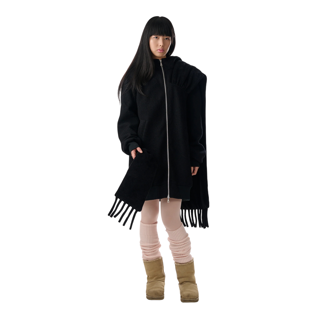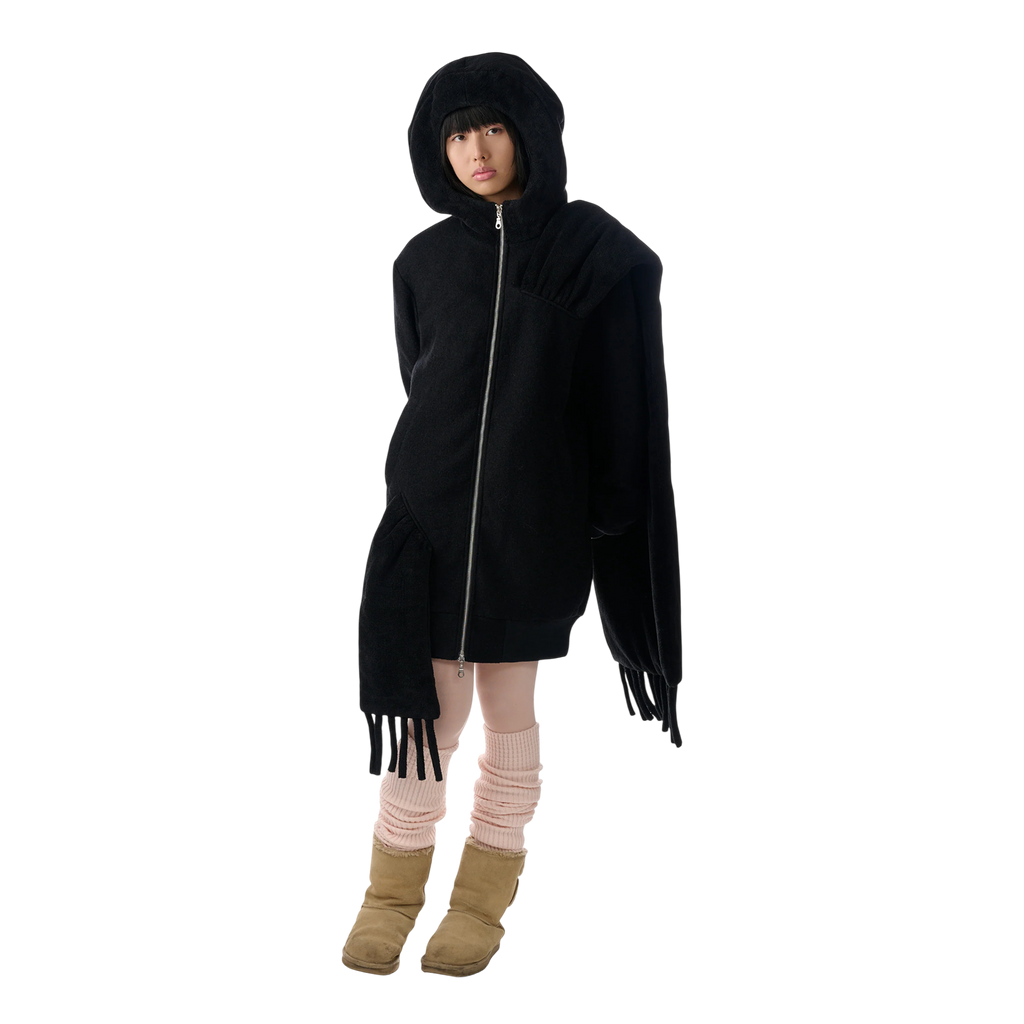 Relaxed zip-up hoodie bomber in black with attached oversized towel scarf draping along the shoulder and back.